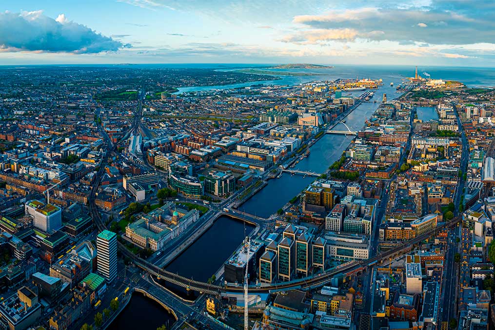 Aerial view of Dublin city, Ireland, showcasing its architecture and layout, ideal for someone relocating from California.